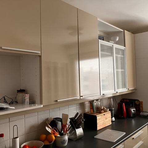 Vanha lastulevystä valmistettu kaapisto. Leveys 275cm, syvyys 60cm, korkeus 247cm. Helposti irroitettavissa ja omat kantajat mukaan.