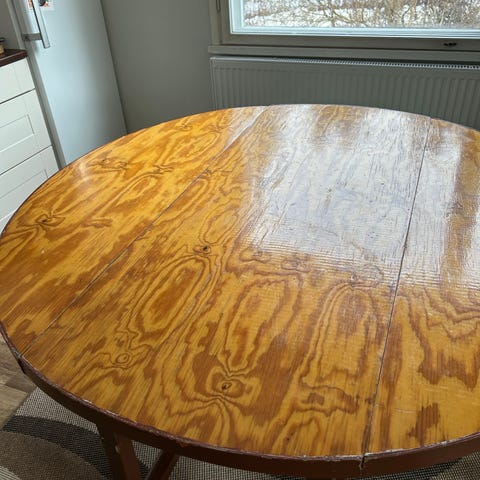 Myydään rustiikkinen pyöreä sohvapöytä eläväpintaisella puukannella. Kansi oletettavasti mangopuuta, jalat metalliset.
