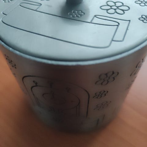 Hopeinen kastetodistuksen säilytysputki telineellä. Putkeen on kaiverettu kuvia ja siihen voi kaivertaa lapsen nimen. Mukana myös pienet hopeiset rasiat ensimhampaalle ja -kiharalle. Ostettu Kultaportista, ovh 76€.