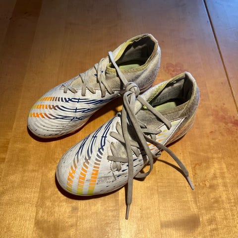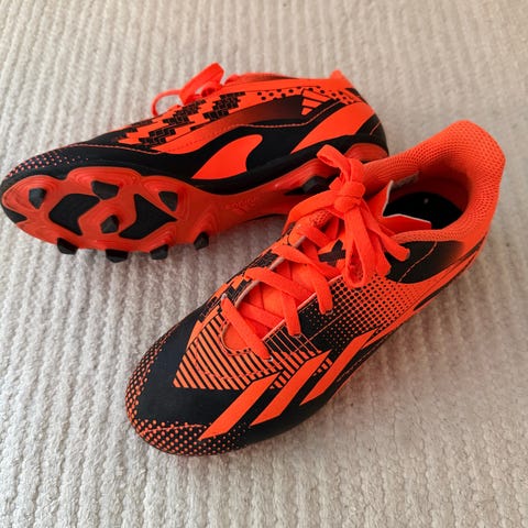 Adidas Messi jalkapallokengät lapsille. Koko US 11,5K, UK 11K, FR 29, JP 175, CHN 175. Kengissä on nappulapohja nurmikentille ja synteettinen päällinen. Väritys on hopea ja vaaleansininen, nauhakiinnitys ja matala varsi. Soveltuvat jalkapallon pelaamiseen ulkokentillä. Olleet puoli vuotta käytössä 6-vuotiaalla, kunnes into jalkapalloon lopahti. Vasemmassa kengässä hieman painaumaa, muuten erinomaisessa kunnossa.