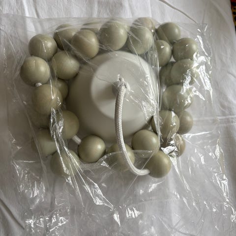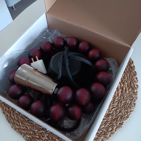 Uusi luumunvärinen Aarikan Reitti-valaisin. Musta johto, luumunväriset puupallot. 65e