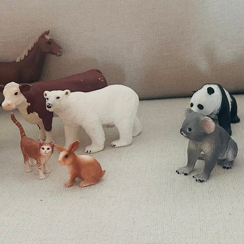 Schleich eläinfiguurit. Joutsen, kana, possu, kissa ja kaksi koiraa.