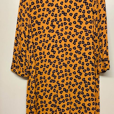 Indiska naisten tunika, koko L, kaunis vaaleansininen kuviollinen kangas, jossa valkoinen kukka- ja lehtiprintti, pitkät hihat ja nappikiinnitys edessä alas asti ja hihansuissa. Malli on väljä, rypytyksiä edessä ja takana, pituudeltaan tunikamainen,halkiot molemmilla sivuilla.Materiaalista ei tietoa, mutta hyvin laskeutuva ja siliävä kangas,
