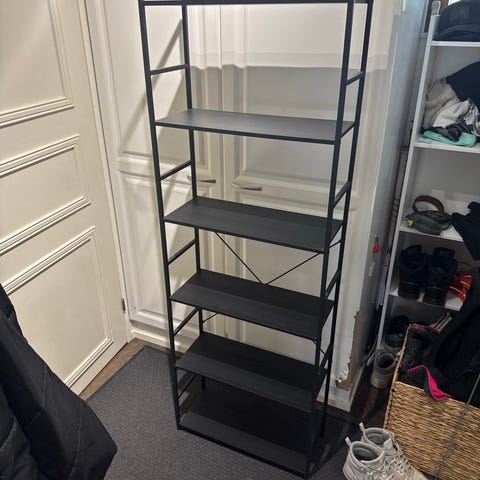 hyllykkö, jossa kaksi puunsävyistä hyllytasoa ja valkoiset metalliset kannattimet. Hyllykkö on kapea ja korkea, ja se soveltuu esimerkiksi kirjojen, koriste-esineiden tai pientavaroiden säilytykseen. Runko on puukuvioitua levyä, ja hyllytasot sekä sivut muodostavat avoimen rakenteen, jonka voi sijoittaa seinän viereen tai tilanjakajaksi. Muotoilu on pelkistetty ja suoraviivainen, sopien monenlaiseen sisustukseen. Nouto Vaajakoski.