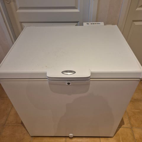 Whirlpool valkoinen arkkupakastin, tilavuus 99 litraa.