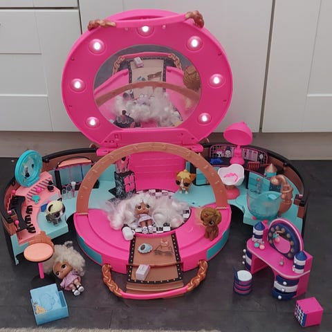 LOL kampauspää. Tukka pysynyt oikein siistinä. Mukana useita hiustarvikkeita, kuten kampa, hiusklipsejä, donitseja, mutta ei kaikkia alkuperäisiä. Mahdollisesti vielä joitain löydetään. Nuken jalustassa on laatikko pienten tarvikkeiden säilytykseen.