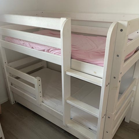Kaksitasoinen lastensänky, jossa ylä- ja alasänky. Sängyssä on tikkaat sivussa sekä suojalaidat. Materiaalina maalattu puu ja värinä valkoinen. Sopii kahdelle lapselle nukkumiseen ja tilan säästämiseen lastenhuoneessa.