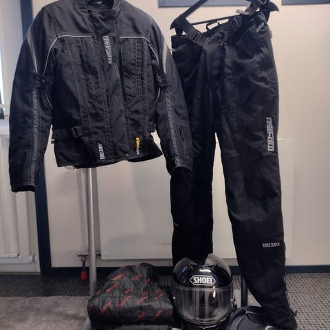 Sweep naisten ajopuku, johon kuuluu ajotakki, ajohousut ja hanskat (koko m). Koko 36. Värit musta, punainen ja valkoinen takissa, housut mustat. Materiaalina tekstiili, takissa ja housuissa verkkovuori. Vähän käytetty. Puolisoa ei enää kiinnosta kyydissä istua. Myydään pakettina! Toisessa ilmoituksessa väreihin sopiva kypärä, joka myydään erikseen. Asu on ollut naisella käytössä pituus 168. Kulkeutuu Kontiolahti-Joensuu omien menojen mukaan. Ostaja maksaa postikulut.