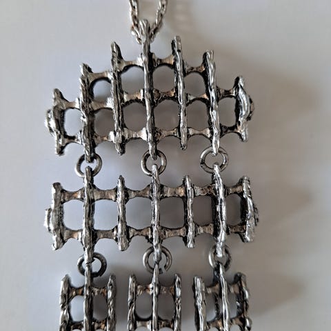 Tapani Vanhatalo kaulakoru, tinakoru. Riipus on pitsimäinen ja pyöreä, keskellä korukivi.