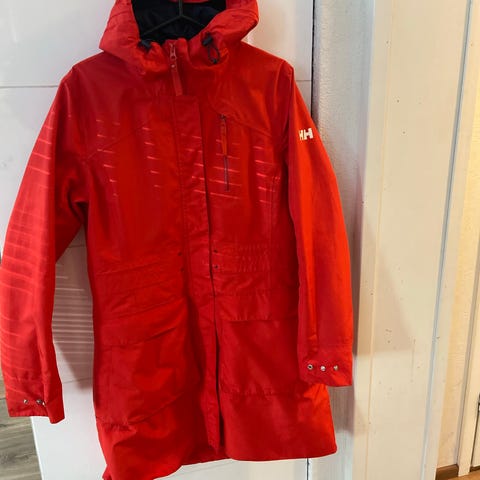 Käytetty naisten Helly Hansen kevyt ulkoilutakki / kuoritakki. Väri viininpunainen. Pientä haalistumaa takin värissä johtuen pesuista, mutta siisti ja käyttökelpoinen takki. Kaikki taskut, napit ja vetoketjut toimivia. 2 taskua edessä ja 1 sisällä (povitasku).
