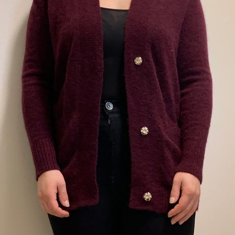 Käsin neulottu, violetti neuletakki koristeellisilla napeilla.