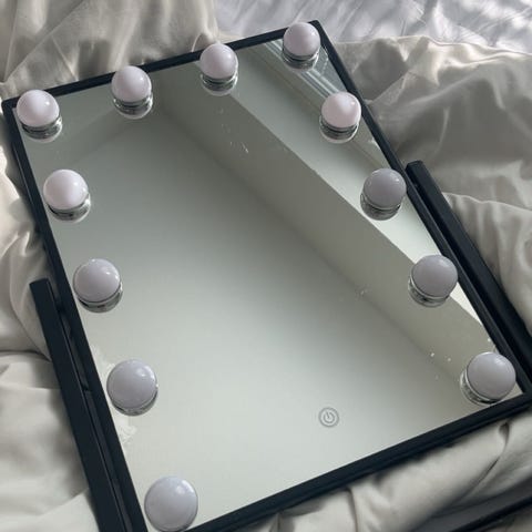 Siisti ja ehjä meikkipeili valoilla, joissa himmennin. Saa pidettyä pöydällä pystyssä takana olevan tuen avulla.