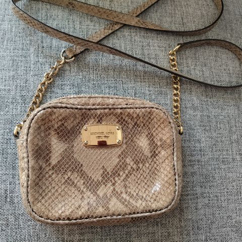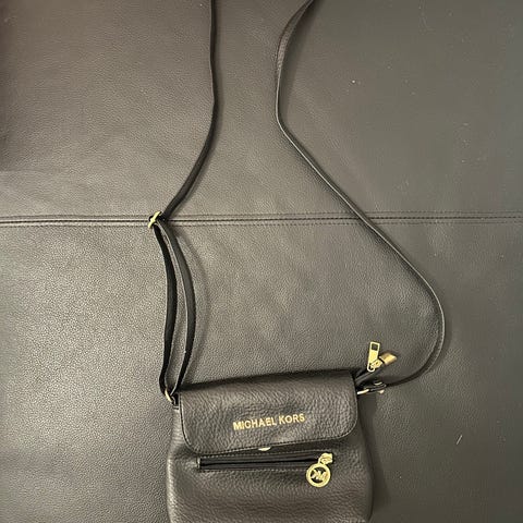 Michael Kors pienehkö olkalaukku. Laukku on mustaa nahkaa ja siinä on säädettävä ja irroitettava olkahihna. Hihnassa on kuvassa näkyvää kulumaa. Laukussa on vetoketjulla suljettava päälokero sekä sisätasku. Lisäksi löytyy lenkki johon voi kiinnittää esim avaimet. Ostettu Rooman Michael Kors liikkeestä.