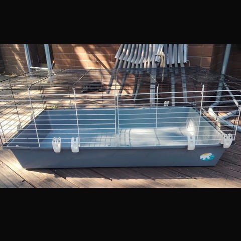 Kanin häkki ollut käytössä pari vuotta. Ollut varastossa noin 2 vuotta käyttämättömänä. Pohja on muovia ja yläosa puuta, jonka saa irti. Häkissä on ylhäältä avautuva kansi, joka helpottaa siivousta ja eläimen käsittelyä. Puupinnoissa on kulumaa ja naarmuja, jotka näkyvät kuvissa. Mitat 125x64,5x51cm.