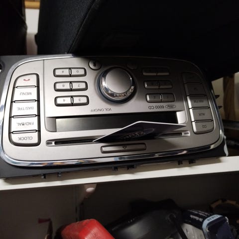 Ford 6000 CD autosoitin. Laitteessa on CD-soitin ja AUX-liitäntä etupaneelissa. Etupaneeli on musta ja siinä on painikkeet radion, CD-levyjen ja AUX-lähteen ohjaukseen sekä näytön kellon säätöön. Sopii Ford-automalleihin, joissa on yhteensopiva Ford Audio Systems -liitäntä. Takana on tehdasvakio liitinpaikka ja antenniliitäntä auton johtosarjaa varten.