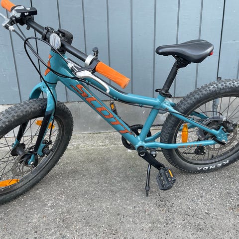 Hyväkuntoinen lasten Scott-maastopyörä 20" Kenda Booster -renkailla, Shimano Toyrney - kiertokahvavaihteilla ja SR Suntour -etujousituksella.