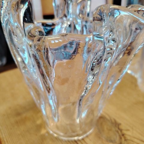 Käyttämätön beige tai vaalean keltainen lasimaljakko / vaasi. Halkaisija 20 cm, korkeus 18 cm, suuaukko 12 cm.