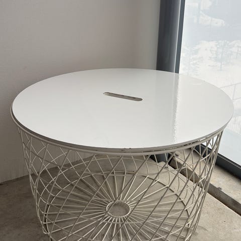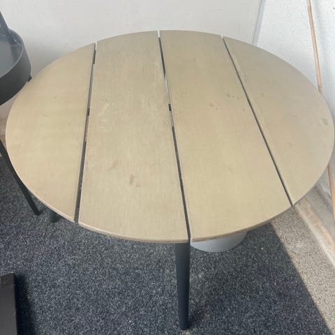Metallinen pyöreä pöytä ulkokäyttöön. Pöydässä on alumiininen tai teräksinen jalka ja kolmijalkainen jalusta. Pöytälevy on metallia, jossa on kuvioitu pinta. Sopii esimerkiksi terassille, parvekkeelle tai pihalle. Korkeus 72 cm ja halkaisija 60 cm tavanomaiset pienehkölle kahvilapöydälle.