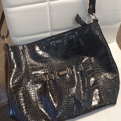 Sympaattisella nipsulukolla varustettu kiiltonahkainen Jouni-laukku. Metalliosat hopean väriset. Irrotettava, säädettävä ohut hihna.