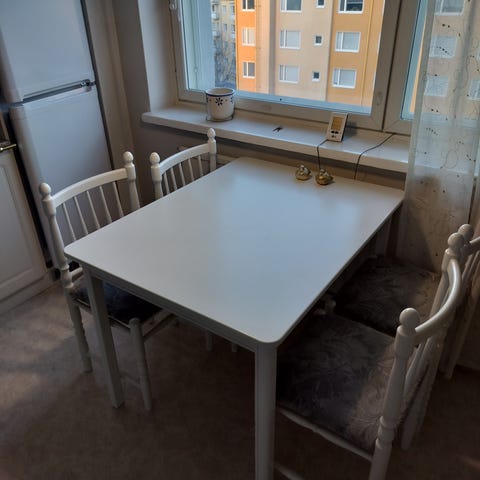 Ruokailuryhmä, johon kuuluu valkoinen ovaalinmuotoinen jatkettava ruokapöytä ja harmaalla kankaalla verhoillut tuolit. Pöydässä on keskellä jatkopala, jonka avulla pöydän pituutta voi säätää. Pöydän jalka on keskellä oleva pyöröjalka, josta lähtee neljä kaarevaa tukijalkaa. Tuoleissa on korkea selkänoja, napitettu verhoilu ja valkoiset puujalat. Ryhmä soveltuu ruokailutilaan tai keittiöön useamman hengen käyttöön.