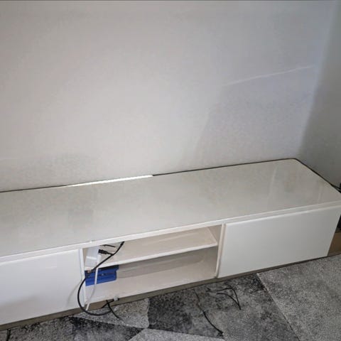 Myydään sotkan valkoinen korkeakiilto tv taso. Toisen laatikon alareunassa lohjennut pieni pala pintaa.