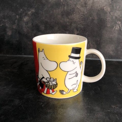 Arabia Muumi muki Perhe. Keraaminen muki, jossa monivärinen Muumi-aiheinen kuvitus kupin ulkopinnalla ja valkoinen sisäpinta. Soveltuu kuumille ja kylmille juomille arki- ja kahvihetkiin. Pohjassa Arabia Finland -leima. Hinta 40,- kpl ja minulla on niitä 2 kpl.