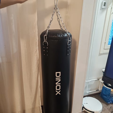 Dinox nyrkkeilysäkki sisäkäyttöön. Väri musta, materiaali synteettinen nahka. Säkki kiinnitetään ketjuilla yläosasta telineeseen. Soveltuu nyrkkeily- ja potkutreeneihin kotona tai harjoitustilassa. Mukana kiinnitysnaru. Paino 24 kg. Nouto tai toimitus pääkaupunkiseudulle.