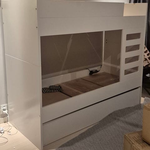 Yhdellä lapsella käytössä ollut Ikean sänkysäilytyskokonaisuus. Mieluisa sänky ollut pitkään, mutta lapsi kasvanut jo tästä kokonaisuudesta isoksi. Siisti patja mukana. Muutama pieni peitettävissä oleva kolhu laatikostossa tuolista tulleita, jotka näkyy kuvissa. Ei piirrosjälkiä ja muuten hyväkuntoinen. Laatikostot ja kaapit toimivat edelleen. Kuitenkin likaa löytyy ja pesu jää ostajalle.