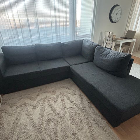 Myydään edullisesti muuton vuoksi kuvassa oleva ehjä, tummanharmaa ja mukava avokulmasohva n. 218cm x200cm. Koirataloudesta, jonka vuoksi sohvasta löytyy koirankarvoja.