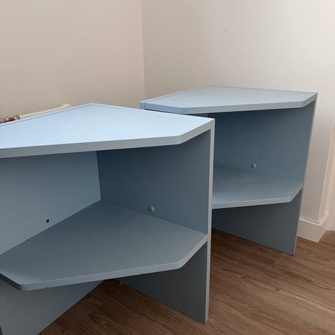 Kaksi metallista hyllyä, käytetty yöpöytinä