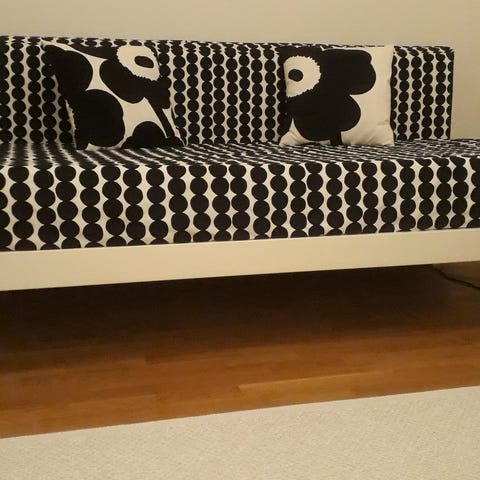 Marmekko unikko puffi/rahi. Väriltään Musta/valkoinen. Siistikuntoinen, ollut nyt reilun vuoden pois käytöstä, ei löytänyt enää meiltä paikkaa.