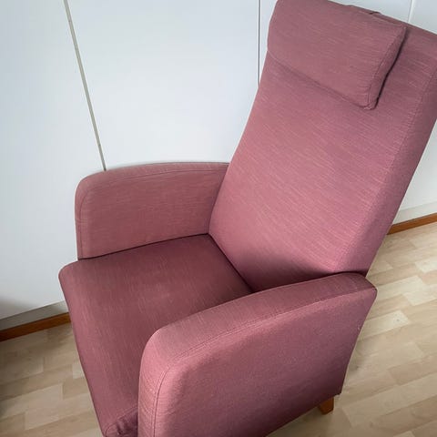 Persoonallinen nojatuoli, hyvä istua, päällinen pellavaa, irrotettava, voi tehdä omanlaisen päällisen, jos innostuu. Annetaan tarpeettomana. Ainoastaan haku.