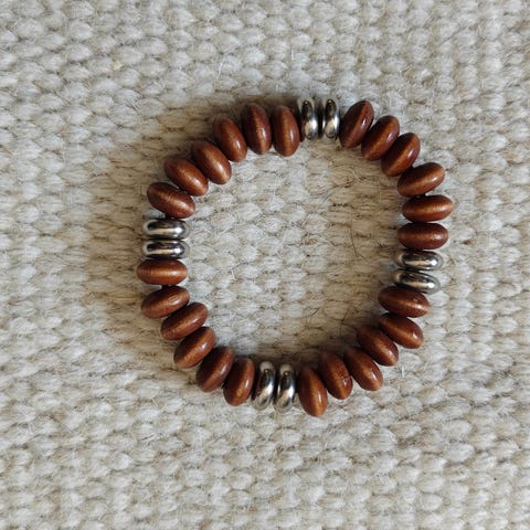 Aarikka kaulakoru unisex-käyttöön. Korussa on mustia helmiä ja osia, jotka on valmistettu puusta sekä teräksestä.