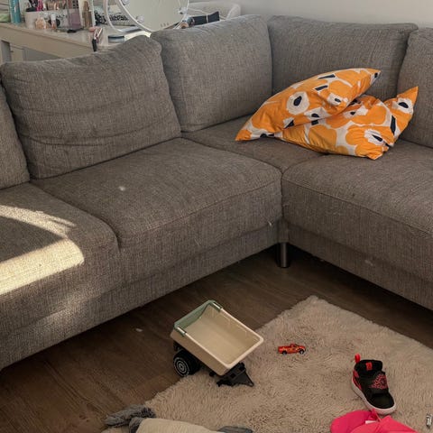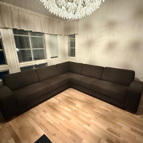 Iso ja mukava kulmasohva myynnissä muuton vuoksi, käytön jälkiä näkyy enkä kaikkea ole varmasti huomannut (kuvat).