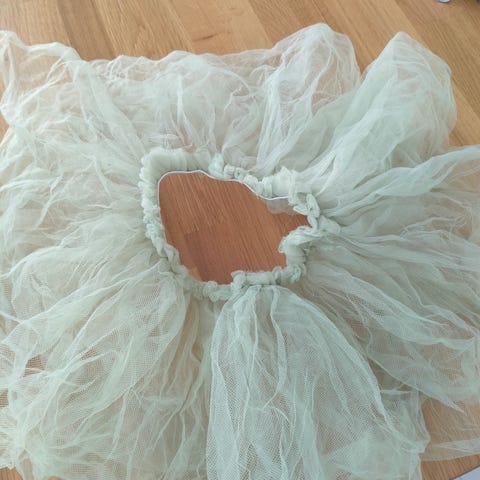 2 muhkeaa tyllihametta, alla tummansininen alushame ja sen alla shortsiosa.