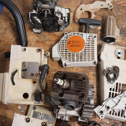 Kuvissa näkyvät sthil ms 170 osat. Kone ei ole kunnossa pytyssä ja männässä jotain vikaa/jälkiä. Kaikki yhteensä 55e