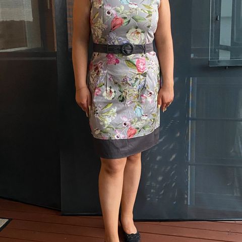 Kirjava hihaton mekko juhlakäyttöön. Päällinen puuvillasekoitetta. Takana vetoketju. Mahdollisuus asustaa vyöllä, pienet vyölenkit.
