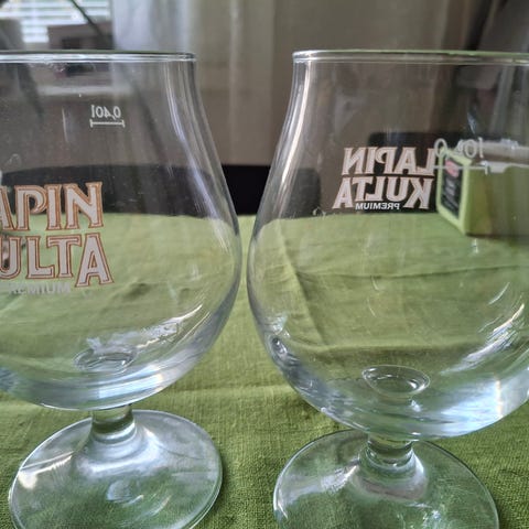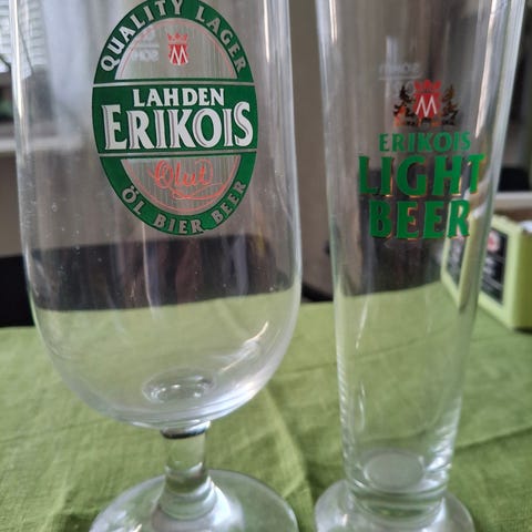 &Tradition olutlasit, joissa Lahden-olutlogo. Korkeat, kapeat kirkkaat lasilasit, sopivat erityisesti oluen tai muiden kylmien juomien tarjoiluun. Kuviointi vihreällä ja punaisella painatuksella lasin kyljessä.