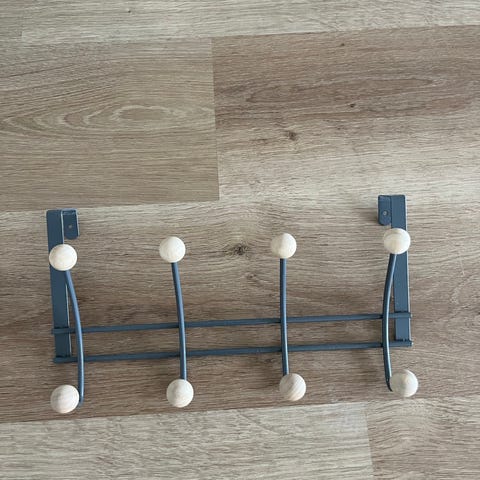 Puinen naulakko, jossa metalliset koukut. Naulakossa koukkuja, jotka on muotoiltu pienten lapioiden ja haravien näköisiksi.