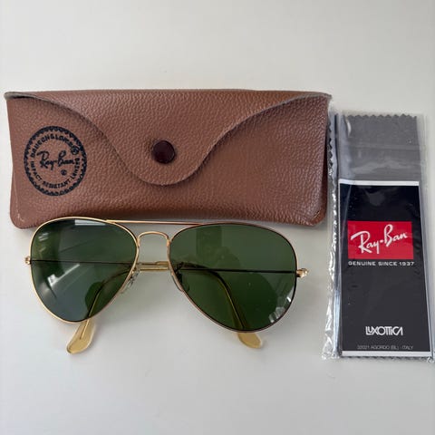 Hyvässä kunnossa olevat aidot Ray Ban Aviator-lasit 80-luvulta. Ei naarmuja linsseissä, vihreät linssit, kultasangat. Mukana alkuperäinen nahkakotelo, jonka voi laittaa vyöhön kiinni.