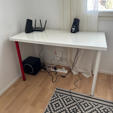 Pöytä on perus hyvässä kunnossa, mutta monitorivarresta on jäänyt pienet painaumat kanteen (kuvassa). Ei näy kuin valoa vasten, ja ei haittaa käyttöä