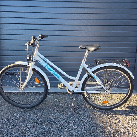 Tunturi Spin tyttöjen/ naisten kaupunkipyörä 26". Pyörässä on 26 tuuman renkaat ja matala runko, joka helpottaa kyytiin nousua. Väritys on valkoinen turkooseilla yksityiskohdilla. Varusteluun kuuluu etu- ja takalokasuojat, takatavarateline sekä seisontatuki. Ohjaustangossa on kierrettävä 7-vaihteinen vaihdevipu. Sopii kaupunki- ja arkiajoon.