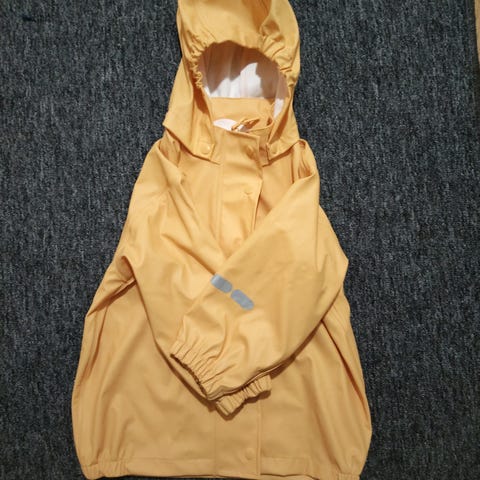 Uutena ostettu ja yhdellä käytetty sadetakki koossa 98. Hyvä käytetty kunto, joku tahra kyljessä, näkyy vaan sisäpuolella.