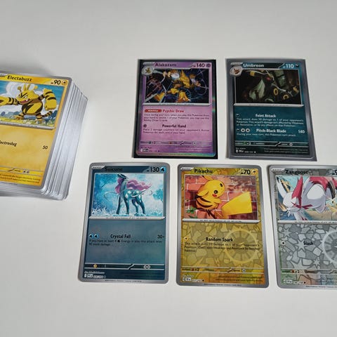 Myydään Pokemon kortteja 700 kpl. Kortit on laskettu, joten tässä on vähintään 700 korttia. Kortit on lajiteltu kasoihin tyypin mukaan. Sekalaisia kortteja monesta eri setistä. Suurinosa korteista on hyväkuntoisia ja uudemmista seteistä, mutta seasta löytyy myös jonkin verran vanhempia kortteja. Sisältää runsaasti kaksoiskappaleita. Ei sisällä holokortteja. Ei sisällä energia- tai trainerkortteja. Kaikki kortit ovat aitoja englanninkielisiä kortteja. Nouto tai postitus. Kaupan päälle 150 trainerkorttia, jos ostaja niin toivoo.