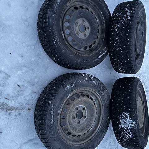 Käytetyt nastarenkaat alumiinivanteilla. Nastoja hyvin jäljellä ja pintaa noin 5-6mm. Ollut vuoden 2011 VW Golf Variantissa.