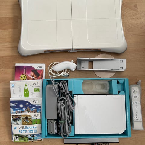 Nintendo Wii pelikonsoli. Mukana kuvassa näkyvät tarvikkeet, kuten rattiohjain ja johdot, sekä ainakin kaksi Wii-peliä (mm. ajopeli ja Mario-teemainen peli). Konsoli soveltuu yhteensopivien Wii-pelien pelaamiseen ja liikeohjauksella toimiviin peleihin.