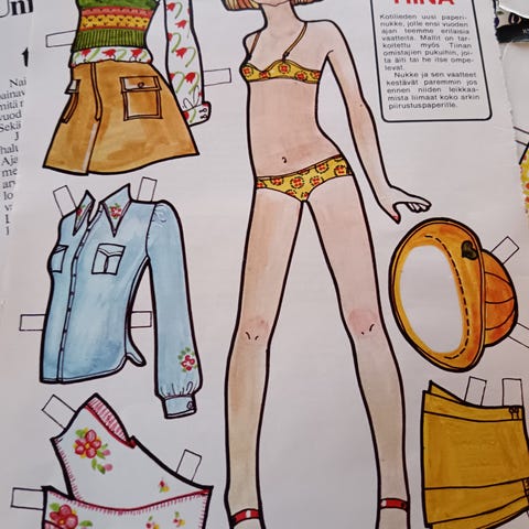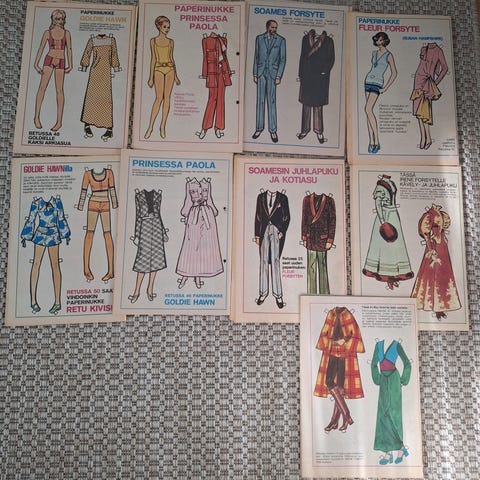 Kuvissa näkyvät Kotiliesi-lehdessä 70-luvun alkupuolella olleet leikkaamattomat paperinuket ja vaatearkit.