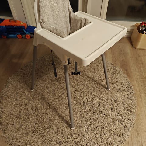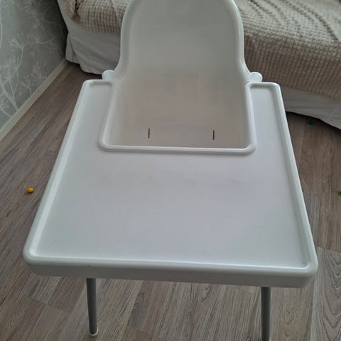 IKEA syöttötuoli, valkoinen muovinen istuin ja irrotettava tarjotinosa. Metalliset jalat. Varustettu turvavöillä lapsen kiinnittämistä varten. Soveltuu pienille lapsille ruokailuun ja muuhun istumiseen pöydän ääressä.