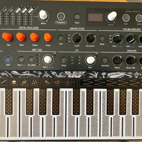 Analogisyntikka jostain 2010-luvun alkupuolelta. Toimiva, mutta näissä on "tyyppivikana" potikanhattujen ja muiden osien tahmaantuminen. Jollain alkoholilla lähtee kyllä tahma pois, mutta itsellä ei ole tarvetta syntikoille joten en jaksanut putsata. Mukaan saa halutessaan kuvan värikkäät potikanhatut, joissa tosin osoitin ei näytä oikein. Alkuperäiset nupit löytyy ja poweri.