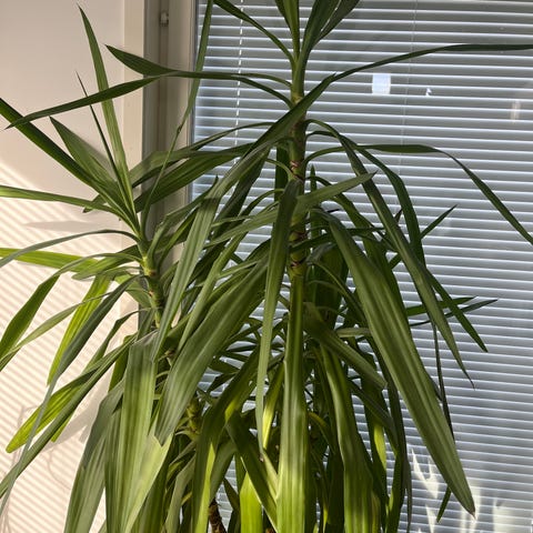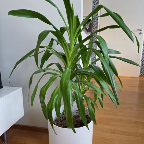 Hyvinvoiva 150cm korkea ruukun alaosasta korkeimpaan oksaan. Noin metrin leveä. Juuri vaihdettu osa mullasta uuteen ja ravittu kasviravinteella. Tekee uutta lehteä. Hieman alimmissa oksissa kärjissä ruskeaa mutta päälioksat kauniissa kunnossa. Hieman kieroon kasvanut ylhäältä mutta oikenee kun muistaa kääntää kasvia välillä.
